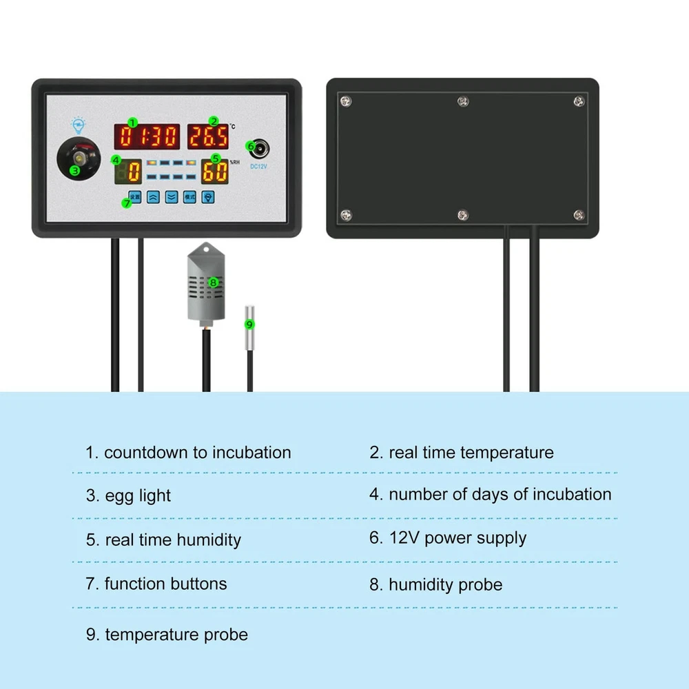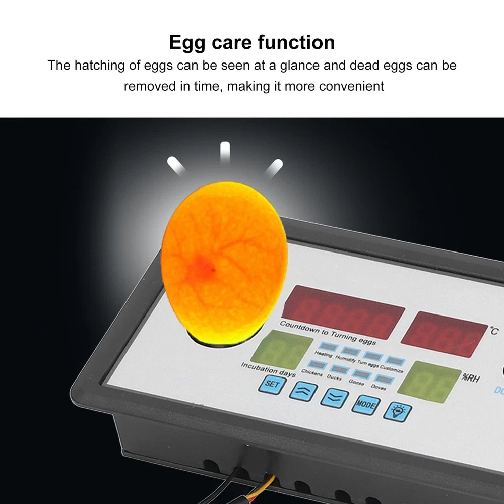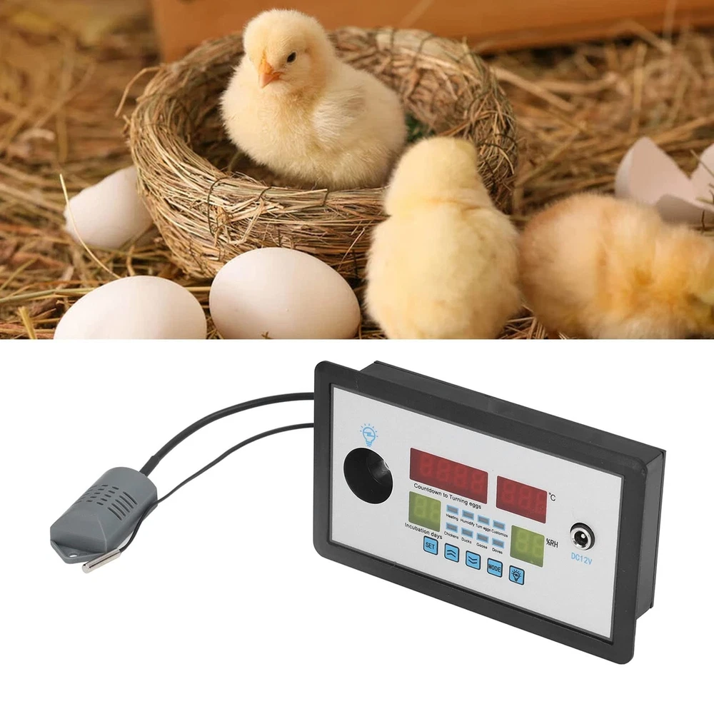 plplaaoo Intelligent Incubator Thermostat,DC 12V 100W Egg Incubator Temperature Controller, Digital Automatic Egg Hatching Incubator Controller for Hatching Duck Eggs Goose Egg Product Details Item Weight: 6.2 ounces Manufacturer: plplaaoo Batteries required: No 34Egg LightThe automatic egg turning incubator thermostat has a photo illumination function, which makes it easier to see at a glance how the eggs are hatching and to reject dead eggs and bad eggs in time. 34Wide UsageSmart incubator thermostat for eggs, duck eggs, goose eggs, pigeon eggs, quail eggs, parrots, peacock eggs, etc. 34MultifunctionIntelligent incubator thermostat with real time humidity and temperature display, countdown timer for incubation days and egg light. Home & Kitchen/Kitchen Dining/Kitchen Utensils Gadgets/Barbecue Tools/Barbecue Tool Sets 34Alarm FunctionThe egg incubator controller thermostat can be set for high and low temperature alarms, stopping heating, high and low humidity alarms and stopping humidification. 34Superior PerformanceThe Intelligent incubator digital thermostat has an integrated humidity probe and is small and stable to meet the diverse needs of users. Specification: Item Type: Intelligent Incubator Thermostat Material: ABS Weight: Approx. 190g/6.7oz Size: Approx. 150x88x30mm / 5.9x3.5x1.2in Voltage: DC12V Power Supply Power: 100W Humidity Range: 0-99%RH Temperature Range: 0°-99.9°C Egg Turning Cycle Setting: 0-999 (min) Egg Turning Time Setting: 0-999 (sec) Applicable Objects: For Eggs, Duck Eggs, Goose Eggs, Pigeon Eggs, Quail Eggs, Parrot Eggs, Peacock Eggs Etc. Package List:1 x Intelligent Incubator Thermostat 1 x Manual Note:1. 21 days for eggs, 28 days for duck eggs, 30 days for goose eggs, 18 days for pigeon eggs, 18 days for quail eggs and 28 days for peacock eggs. The incubation period varies. All eggs are divided into 2 stages, the early stage and the late stage, with the late stage referring to the incubator. In the last 3 days of the cycle, the number of days varies according to the early incubation period. Please remove the incubation net in the early stage and remove the egg tray and put it back in the incubation net in the last 3 days.The following is an example of an egg. For incubating eggs, there is no need to adjust the temperature throughout the incubation period. The temperature is always 37.8 and 1 to 2 pots of water are added daily. The humidity level is about 60% at the beginning of the incubation period and about 75% at the end of the incubation period. (This method is suitable for those with no experience of hatching.)2. If the humidity level is too high, no adjustment is necessary, when the humidity level is below 55%.
