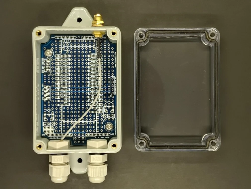 Perfect for any DIY IOT project, qBox Enclosure Kit series is the part of the newest HW platform designed to help hobbyists, makers and all DIYers to build environmental ready IOT solutions: Flanged IP65 waterproof enclosure : Sealed, made of high-quality ABS material suitable for indoor and outdoor DIY IOT projects Incorporated M8 cable glands : Two cable inputs securely allow bringing the power in and connecting sensors and actuators Perfect fit PCB : High quality double sided PCB with 0.1" hole spacing for DIP integrated circuits, modules and main controller board Fixed placement for controller board : Well designed PCB allows to carry variety of MCU boards like Feather Compatible, Arduino MKR Compatible, NodeMCU, etc One built in SMA connector : One SMA Straight Female to IPEX() adapter cable gives external antenna connection to your wireless board Each qBox kit consists of durable waterproof IP65 enclosure with installed PG7 glands, double sided PCB with dedicated placements for IOT controller and connectors and one integrated SMA to adapter cable. External DC voltage from power adapter or solar system could be brought by cable through the one gland inner and another gland gives opportunity to connect external sensors or actuators. One LTE / WiFi / LoRa / etc. external antenna could be connected to wireless board connector via SMA to IPEX () adapter cable glued into enclosure wall. Two M3 self tapping screws securely attach the PCB to the enclosure. Enclosure has enough room to keep with or without stacking header one controller board like Feather Compatible or Arduino MKR Compatible or another IOT board, power supply, OLED display and sensor modules using plain grid proto holes. Up to four pluggable 3,5mm terminal blocks, one Grove and several DIP 0.1" I2C and SPI interface connectors could be populated. Four holes and fasteners kit allow to mount Arduino Uno compatible board at the top of PCB. Transparent lid lets see electronics, LEDs and display and is able to hold LiPol battery to be applied to the internal surface. Using qBox Enclosure Kit the variety of IOT DIY and POC projects could be done, like LoRa-based soil moisture monitoring project, home WiFi garage door opener, NB-IOT bee hive monitoring system, GSM GPS tracking solution and many others. What's included: - IP65 waterproof enclosure with two M8 glands installed and one SMA adapter cable glued; - High quality prototyping double sided PCB mounted with two M3 self tapping screws (No connectors included). More info: