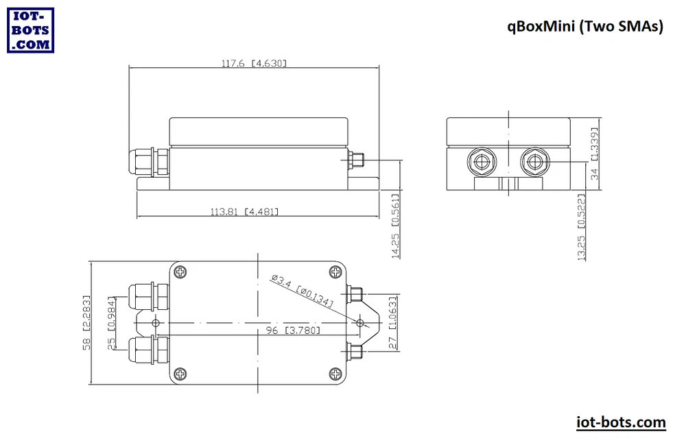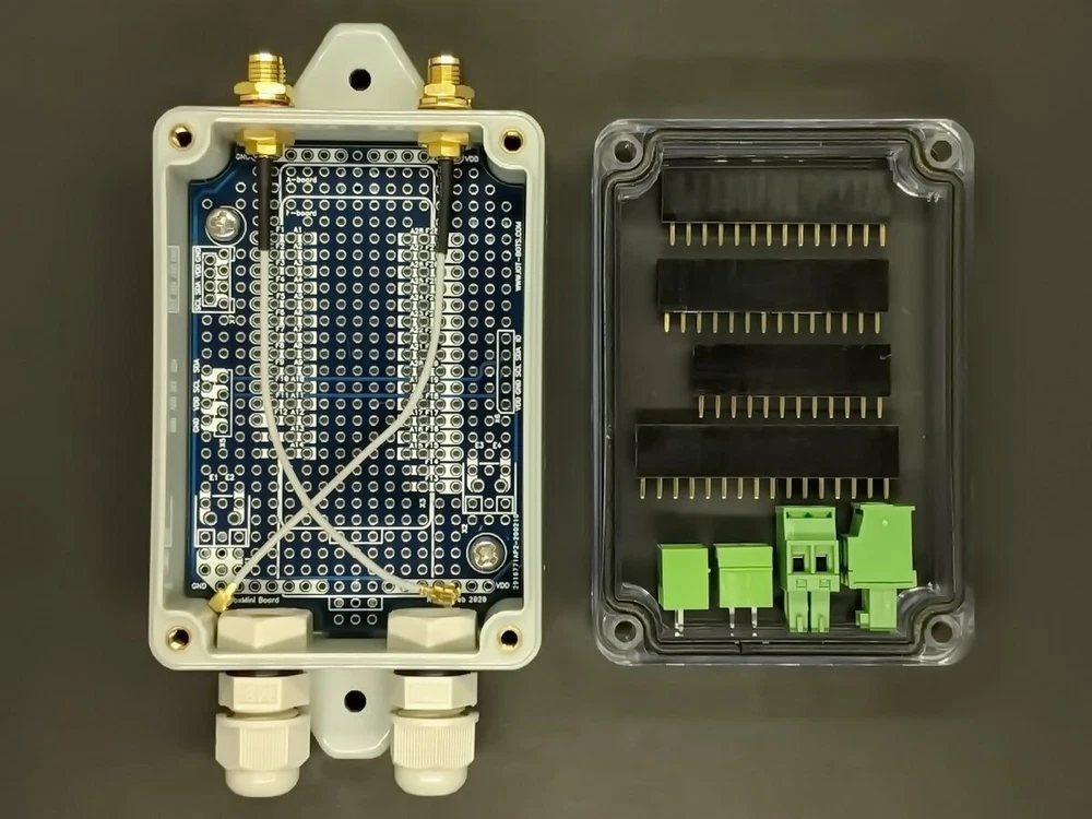 Perfect for any DIY IOT project, qBoxMini Enclosure Plus Kit series is the part of the newest HW platform designed to help hobbyists, makers and all DIYers to build environmental ready IOT solutions. Flanged IP65 waterproof enclosure : Sealed, made of high-quality ABS material suitable for indoor and outdoor DIY IOT projects Incorporated M8 cable glands : Two cable inputs securely allow bringing the power in and connecting sensors and actuators Perfect fit PCB : High quality double sided PCB with 0.1" hole spacing for DIP integrated circuits, modules and main controller board Fixed placement for controller board : Well designed PCB allows to carry variety of MCU boards like Feather Compatible, Arduino MKR Compatible, NodeMCU, etc Built in SMA connectors : 2 SMA Straight Female to IPEX() adapter cables give external antennas connections to your wireless board Each qBoxMini Enclosure Plus Kit consists of durable waterproof IP65 enclosure with installed M8 glands, double sided PCB with dedicated placements for IOT controller and connectors, connectors set and two integrated SMA to adapter cables. External DC voltage from power adapter or solar system could be brought by cable through the one gland inner and another gland gives opportunity to connect external sensors or actuators. Up to two LTE / WiFi / LoRa / etc. external antennas could be connected to wireless board PCB connector via SMA to IPEX () adapter cables glued into enclosure wall. Two M3 self tapping screws securely attach the PCB to the enclosure. Same time board could be easily removed. Enclosure has enough room to keep with or without stacking header one IOT controller board like Feather Compatible (AFC) or Arduino MKR Compatible (AMC) or another IOT board, power supply (DC/DC), OLED display and sensor modules using plain grid proto holes. Up to two pluggable 3,5mm terminal blocks, one Grove and several DIP 0.1" I2C interface connectors could be populated. Transparent lid lets see internal parts, electronics, LEDs and even display and is able to hold LiPol battery to be applied to the internal surface. Using qBoxMini Enclosure Plus Kit the variety of IOT DIY and POC projects could be done, like LoRa-based soil moisture monitoring project, home WiFi garage door opener, NB-IOT bee hive monitoring system, GSM GPS tracking solution, etc. What's included: - IP65 waterproof enclosure with two M8 glands installed and two SMA adapter cables glued; - High quality double sided PCB mounted; - Connectors set (one 1x12 pin DIP 0.1", one 1x16 pin DIP 0.1", two 1x14 pin DIP 0.1", two set of 3.5 mm 2 pins terminal blocks (socket and plug), one Grove 2mm DIP). More info:
