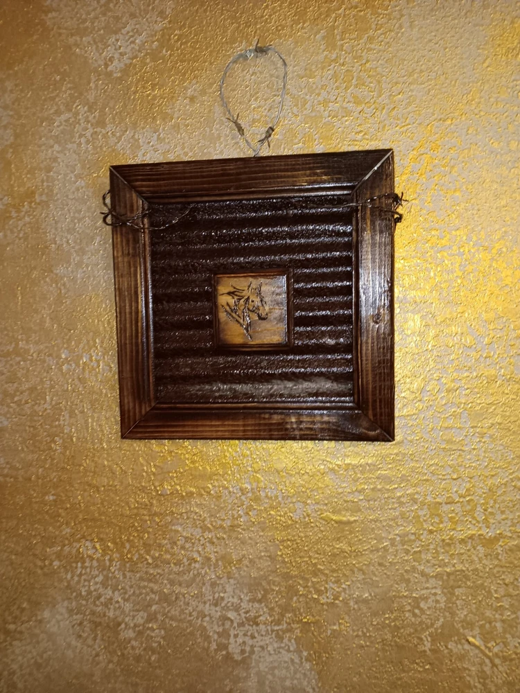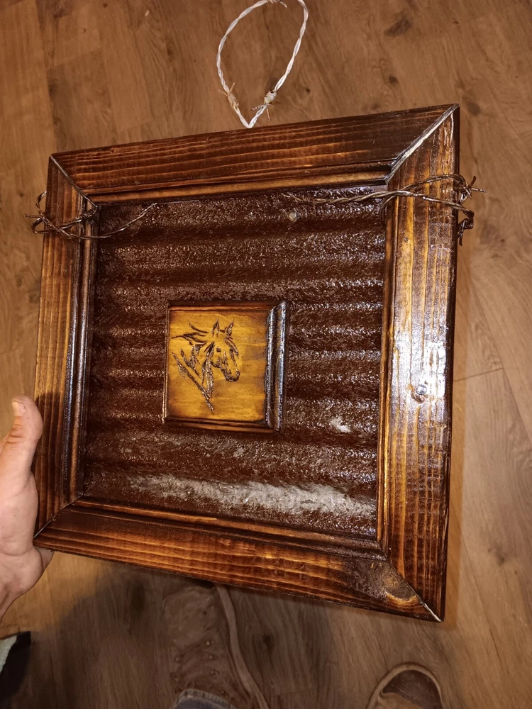 This rustic farmhouse wall decor features a square plaque with a horse theme, perfect for adding a touch of country charm to any room. The hanging plaque is made of wood, metal, and steel, with a lacquered finish for a polished look. The design is rustic and primitive in style, making it a unique and decorative piece for your home. Perfect for horse lovers or those looking to add a touch of Western flair to their living space.