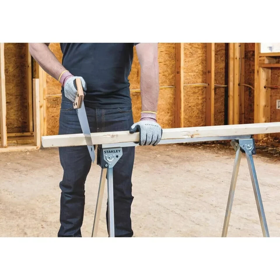 sawhorse saw horse folding 29 inch metal work heavy duty steel 2 pack The Stanley Essential Metal Sawhorse has a sturdy, stable structure that can hold up to 750 lbs. (when using a pair). Its upper metal bar enables direct clamping for a wide range of jobs. Anti-slip rubber pads create friction on the surface while cutting. Folding legs enable quick setup and breakdown. Side latches hold 2 single units together for easy carrying and compact storage. Upper metal bar enables various clamping applications Anti-slip rubber pads create friction on the surface while cutting Stable, metal structure supports up to 750 lbs. (when using a pair) Folding legs enable quick setup and breakdown Side latches hold 2 single units together for easy carrying and compact storage 29 in. H 31-1/8 in. L