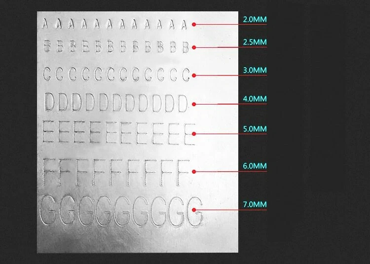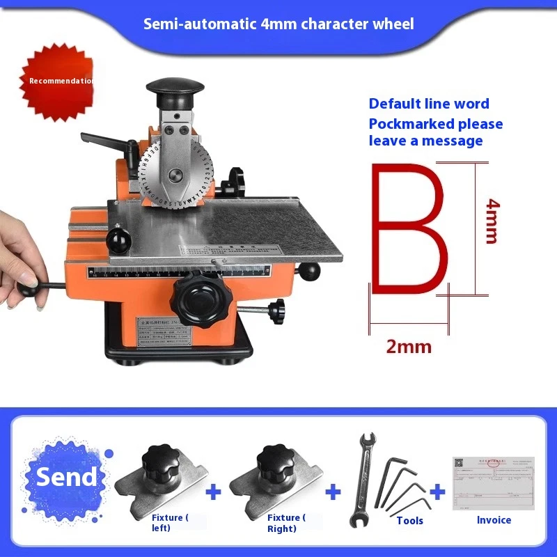 semi-automatic "Name Plate" "Dog Tag ID Card Label Engrave Embosser Marking Tool 1. Packing list 1 SET Manual marking Machine 1PC Character Plate (Character plate size font height: 2mm 3mm 4mm 5mm 6mm Optional, Please leave a message. Otherwise we‘ll’ send 6mm by default 1PC Workpiece fixture 2PCS Allen wrench 1PC Spare transmission belt 1PC Manual 2. Description When a force is externally applied (such as manually pressed or pounded with a rubber hammer) on the alloy steel made dialing disc through high – frequency quenching heat treatment, some letters or numerals in certain depth (0.1~0.3mm) may be printed on the metallic sign board. Turn the character plate to choice the character, pull the spacing given handle, then press the rubber buffer a character is finished on the nameplate. Again, the next. Turn the head handwheel to the next row. The different heights of character shall be subject to replacement of character plate. 3. Features: Special design, very easy to change the character plate With graduated handwheels, precise movement of Letter-spacing and row spacing With special fixture pull rob, fast to fix the nameplate or metal card. Easy to operate. 4. Technical data Printing plate material: iron, aluminum, copper, stainless steel, plastic products. Maximum print size label: ≤ 195mm × 135mm 5. Character plate digital include: Capital letters: A B C D E F G H I J K L M N O P Q R S T UV W X Y Z Arabic numerals: 1 2 3 4 5 6 7 8 9 0 Simple symbols: • × / - (special symbols can be customized)