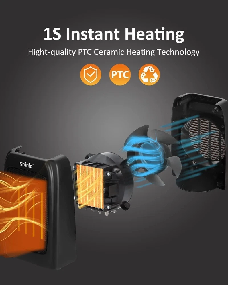 【3 Modes with Thermostat Control】3 Heat Settings; LOW: 900 watts of heat; HIGH: Output heat faster and hotter at 1500 watts; FAN: Blow out cool winds. Electric space heater with thermostat manual control, designed for comfort and warmth, keeping your small room at a set temperature and saving your electricity bills. 【1S Fast Warm-Up】With the PTC ceramic heating technology and high-speed fan, this small space heater can warm you in 1 second! Range up to 200 sq.ft. Saving electricity bills by heating the small space required, instead of using other centralized indoor space heaters. Stay warm and comfortable in your space in the cold once you pick up this energy efficient space heater. 【Multiple Advanced Safety Design】 Overheat and Tip-Over Protection: Aut-off when accident happens, perfect for family with kids and pets; V0 Flame Retardant Material; ETL Listed. The Shinic ceramic space heater, a solid choice for small room,office, living room and bedroom! 【Quiet Space Heater】The operating sound of the office sapce heater is less than 38 dB, quiet enough for most people to use in a bedroom while sleeping, a perfect desk space heater never disturbs you when you sleep or work. 【Space-Saving Desk Space Heater】Dimensions: 6.3 x 5.5 x 9.3 inches; small space heater for office under desk quiet, warm and space-saving. Warm up your body/feet/legs in an instant, but only take a small space. Easy-to-move portable space heaters for indoor use with convenient carry handle and 6 Ft long cord.