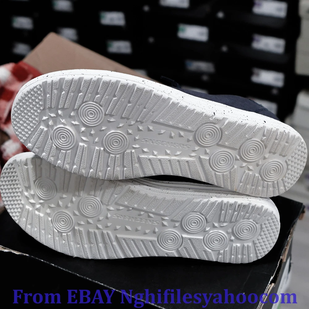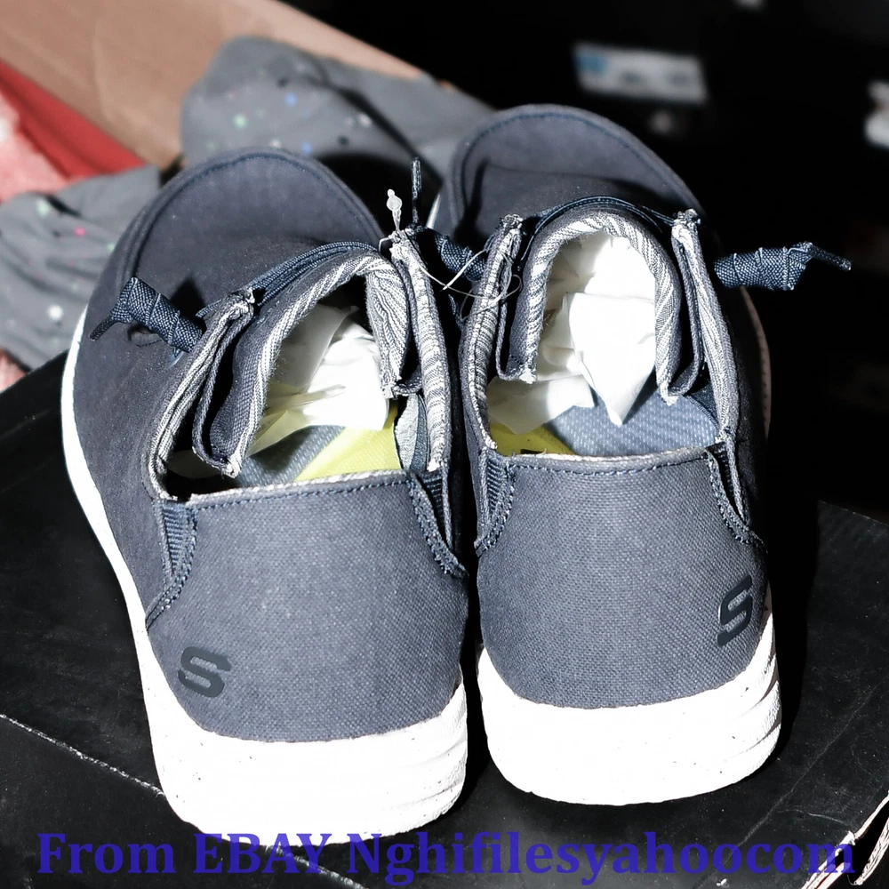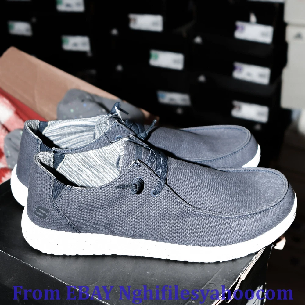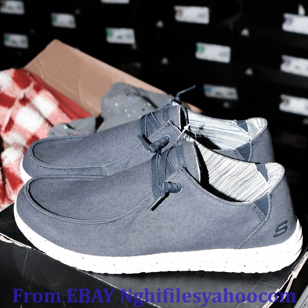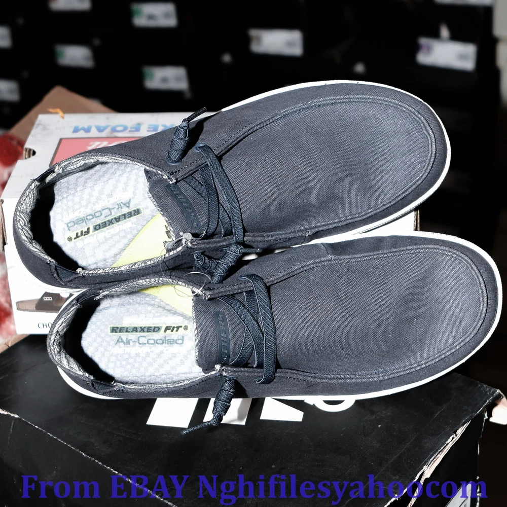 Skechers® Colors: Blue Size : 12 NO shoes box Stitched seam detail Laced front panel with stretch laces Knotted lace ends Dual side stretch fabric panels for slip-on fit Air-cooled memory foam insoles Relaxed Fit® design Made in China Content: Upper: Canvas Outsole: EVA You get the pairs in the ads photos. SHIP ASAP.