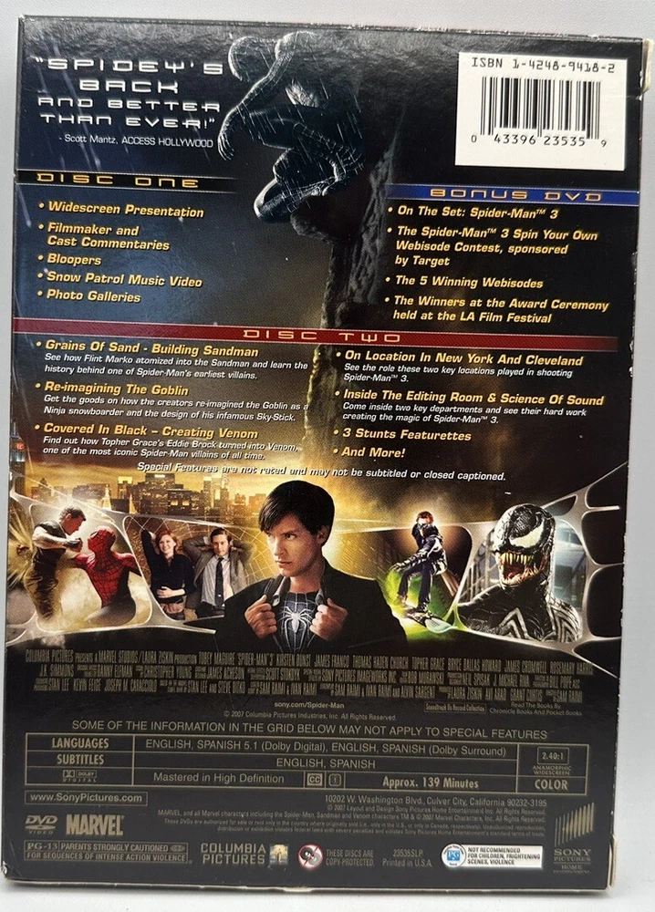 This Spider-Man 3 DVD set is the perfect addition to any movie collection. It features a three-disc widescreen deluxe edition of the action-packed superhero film, starring Tobey Maguire and directed by Sam Raimi. The DVD is region code 1 (US, Canada...) and includes English and Spanish language options, as well as subtitles in English and Spanish. The film is rated PG-13 and falls under the genres of action, sci-fi & fantasy, and adventure. The DVD set includes special features and features a run time of 139 minutes. This item is a must-have for any fan of the Spider-Man franchise or anyone looking for an exciting and action-packed movie night.
