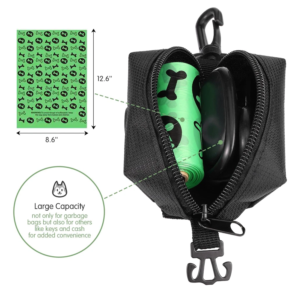 High Quality Dog Poop Bag Dispenser: Our dog poop bag dispenser is made from top-quality oxford fabric that provides enhanced wear resistance and waterproofing. Equipped with a spacious compartment for 1-2 rolls of poop bags, cash, keys, and even dog treats. Outing worry-free while carrying all your essentials in one compact & convenient pouch Convenient Design: Our dog bag dispenser features rubber opening, making it easy to pull out bags one-by-one while keeping the remaining ones securely in place. It adds a touch of fun to your dog-walking routine, It's also a perfect dog lovers gifts for women Hands Free Design: Enjoy a hassle-free walking experience with this dog waste bag dispenser! It frees up your hands from carrying and holding discarded bags. It comes with a separate metal garbage bag carrier that can hold up to two bags at once Easily Attach to Leash: Easily attach this poop bag carrier to any leash or harness with the sturdy climbing buckle and sturdy velcro attachments included - making it a hassle-free way to keep your dog's waste bags handy Compatibility: Fits all standard dog waste bag brands and most roll sizes, including 2.38 x 1.38 inches, 2.5 x 1.25 inches, 2.36 x 1.18 inches, 2.44 x 1.18 inches, etc. Comes with 1 dog poop bag dispenser and a roll of 15 bags for convenience