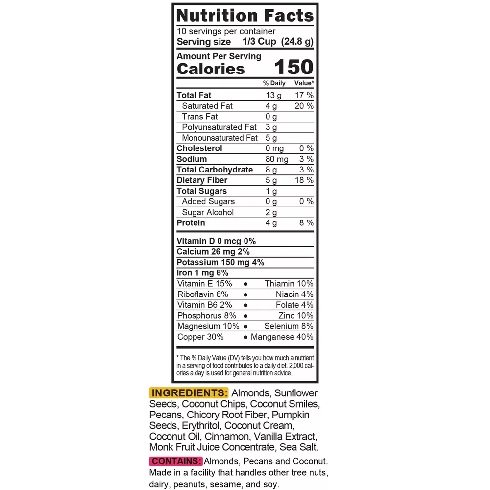 We're nuts about granola, and our keto nut granola is packed with fiber, protein, healthy fats, vitamins and minerals. It has absolutely no sugar added, and is only 1g Net Carb making it one of the lowest carb options out there for ketogenic dieters. You will love this! Sugar? No Thanks!: Our treats won't spike your sugar intake, with barely any sugar per serving. Enjoy guilt-free snacks again! Keto-Friendly & Low-Carb Delight: Enjoy our delicious products without the carbs, excess sugar, artificial flavors or preservatives. Free From Junk: Our products are gluten-free, grain-free, dairy-free, and keto-friendly, offering a wholesome snack choice for all. Good Source of Fiber: Packed with fiber to keep you feeling full and your digestion feeling good. No more cravings! Nutrient-Rich Ingredients: Loaded with protein, vitamins, and minerals from nutrient-dense nuts. Yum! Not today, GMOs!: Made with 100% non-GMO ingredients to ensure the highest quality and safety for you. Low Sodium: Our snacks are low in sodium, helping you maintain a healthy and active lifestyle. Sustainably Sourced: Our ingredients are ethically and sustainably sourced, supporting environmental conservation. Plant-Based: Completely plant-based and vegetarian-friendly, perfect for those following a natural foods diet. High in Antioxidants: Rich in antioxidants to help fight free radicals and support overall health and wellness.