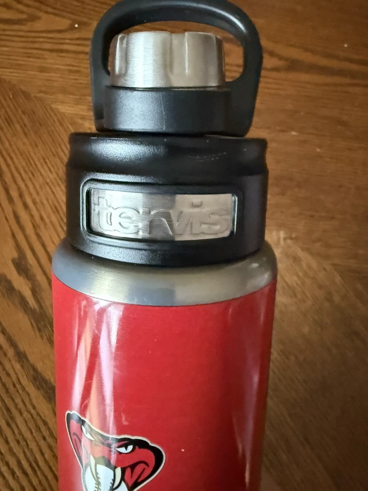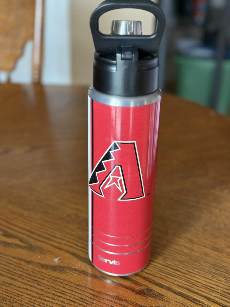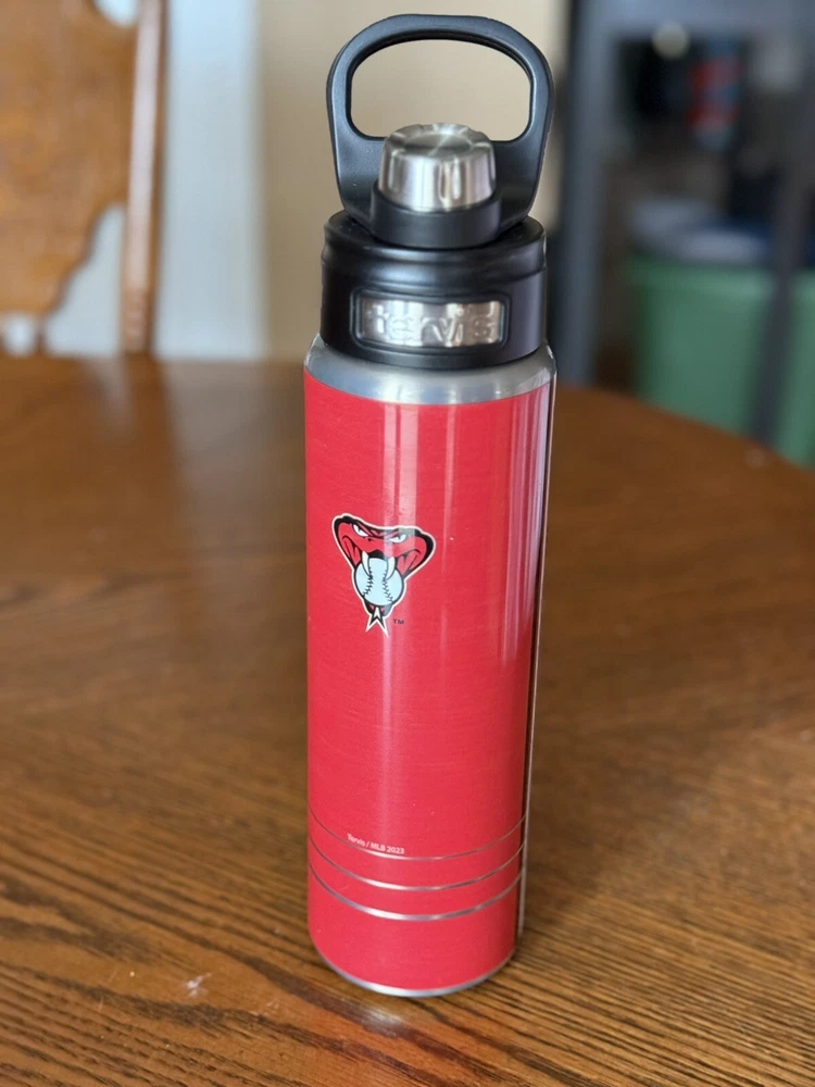 This is a 24 oz Tervis tumbler water bottle featuring the MLB Arizona Diamondbacks. The tumbler is made of stainless steel and is insulated to keep drinks at the desired temperature. It is designed in red color and is perfect for use in the summer. This tumbler set includes a bottle and is ideal for baseball fans and enthusiasts.