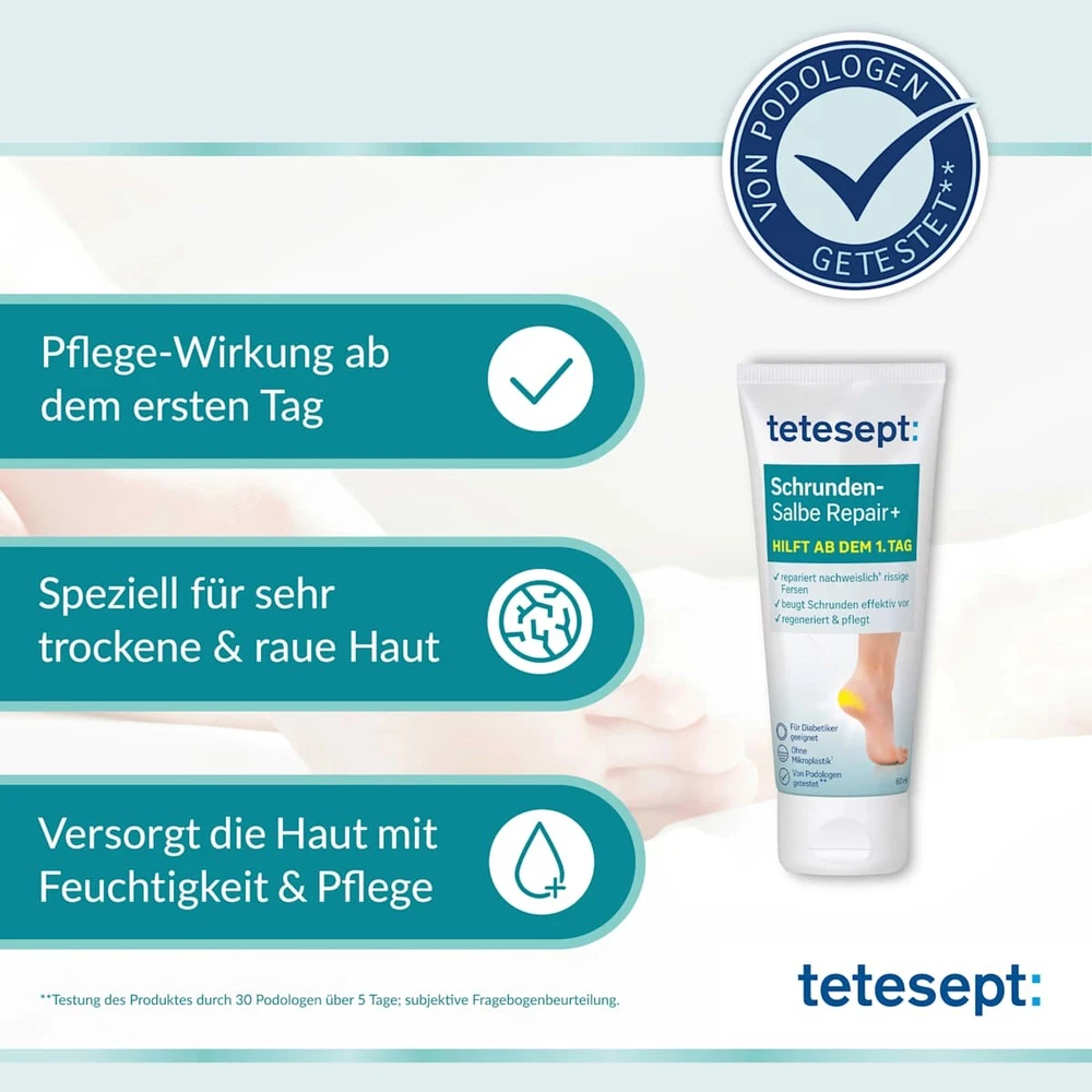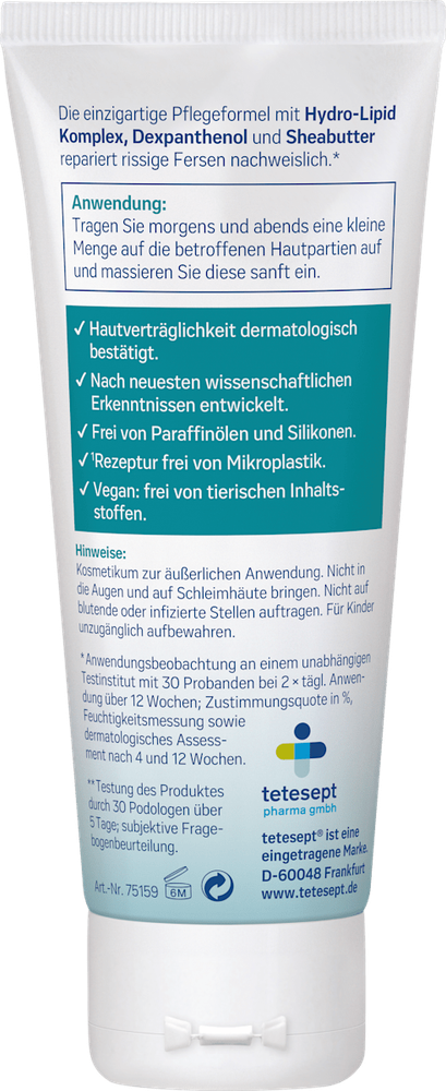 Schrundensalbe works quickly and effectively with a Hydro-Lipid Complex formula. The product is free from microplastics, water-soluble synthetic polymers, paraffins, silicones, and is not tested on animals, making it vegan. The ingredients include natural oils, butters, and plant extracts, such as shea butter, sunflower seed wax, and prunus armeniaca kernel oil. The formula is rich in essential fatty acids, vitamins, and antioxidants that help to nourish and protect the skin. Schrundensalbe is a quick and effective solution for dry and damaged skin. Its key use is to provide intensive care and protection to rough and cracked skin areas. The formula is based on a Hydro-Lipid Complex, which helps to restore the skin's natural barrier and retain moisture. The product is free from harmful ingredients, such as microplastics, paraffins, and silicones, and is not tested on animals. The ingredients include natural oils, butters, and plant extracts that are rich in essential fatty acids, vitamins, and antioxidants. These ingredients help to nourish and protect the skin, leaving it soft, smooth, and healthy. It is recommended to store the product out of reach of children.