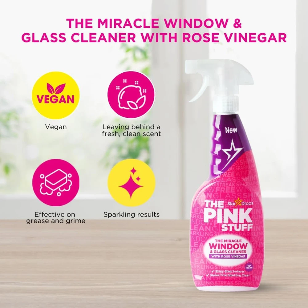 The Power Of The Pink Stuff in Our Versatile Convenient Sprays The Versatile Power Of The Multi-purpose Spray Is Tough On Stains Leaving Shiny Clean Results. Non Drip Bathroom Foam Cleaner, Clings To Surfaces, Removes Dirt And Prevents Limescale. Our Miracle Window Cleaner Removes Grease And Grime From Windows, Mirrors And Other Glass Surfaces. Our Miracle Multi-Purpose Cleaner is a versatile multi-purpose spray cleaner for hard surfaces. Every surface cleaned with our Miracle Multi-Purpose Cleaner is left shiny and clean. The Pink Stuff window cleaner removes grease and grime from windows, mirrors, and other glass surfaces. Every surface that is cleaned with this window cleaner is left sparkling clean, with a streak-free shine, through the power of Rose Vinegar. Make your bathroom sparkle with our versatile non-drip bathroom foam cleaner. Once sprayed this great bathroom cleaner clings to surfaces to penetrate and remove dirt, grease, soap, and grime. In addition to its cleaning properties, it removes and prevents limescale, leaving shiny, clean results.
