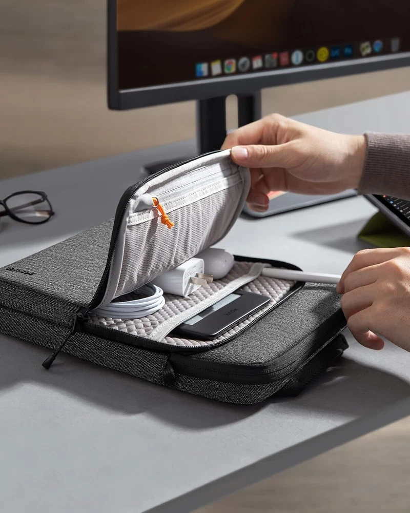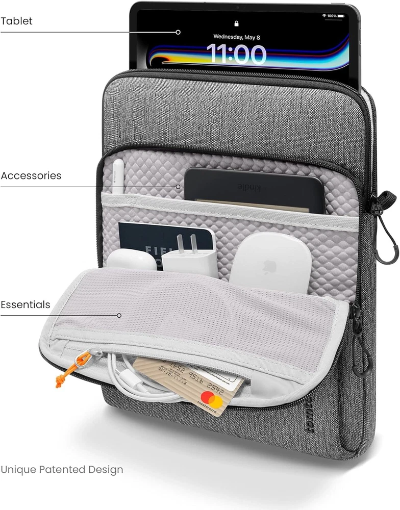 tomtoc Tablet Shoulder Bag for New 11 Inch iPad Pro 11 inch Tablet, Gray Product Details Brand: tomtoc Color: Gray Compatible Devices: 9-11 inch Tablet Form Factor: Pouch Shell Type: Soft Compatibility: Internal dimensions: 10.12" x 7.60" x 0.5"; Perfectly fits new 11-inch iPad Pro M4 2024 & M2, M1 (2022-2018) with Magic Keyboard and Smart Keyboard Folio or Logitech Slim Folio Pro Case, new 11-inch iPad Air M2 & 10.9-in iPad Air 5th/4th Generation (2022-2020), 10.2-inch iPad 9th, Also compatible with Microsoft Surface Go 3/2, 10.1 Samsung Galaxy Tablet, etc. 360 ° Protection: Corner Armor patent design at the bottom corners and 3D soft inner padding in main and front pocket protect your tablet and accessories from drops, bumps and scratches Military Level Material: The tablet sleeve made from firm, and YKK Zipper, the toughest military level collection: Excellent wear resistance, tear resistance, unmatched strength, good hand feeling, softness, easy to care, etc. Large Capacity with Patented Design: Thanks to the large number of inner compartments, all accessories are always neatly reached; The smart organized design offers a main pocket for your tablet and a unique patented front pocket with organized space for kindle, pen, accessories and important business essentials. soft back handle allows easy access to your device and accessories while in your backpack or messenger bag; Removable shoulder strap provide long time comfortably carrying
