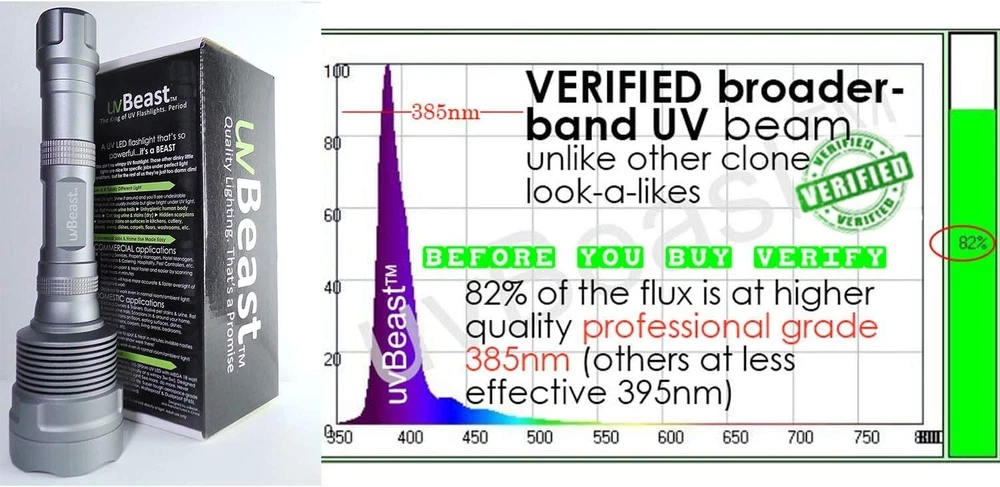 New V3 385-395nm Black Light UV Flashlight - High Power Upgraded Triple Broad Band LEDs Best for Professional/Commercial Use - USA Stock - UK Design WHY uvBeast V3? It's the evolution from 100 LED models. (1) V3 WILL SAVE YOU BIG MONEY IN THE LONG RUN. No more stung by hidden running costs that hurt your pocket. (2) HIGHER UV INTENSITY THAN 100 LED. Delivered by massive TRIPLE 1.2A UV LEDs. (3) UNBEATABLE UV RANGE. Now the UV beam throw goes out to more than 70 feet. This is BIG LEAGUE YOU’LL MAKE BIG COST SAVINGS IN THE LONG RUN. uvBeast V3 does a re-configured power delivery system. Way more efficient than common 100 LED versions. A costly but necessary evil for that tech EVEN HIGHER UV INTENSITY THAN 100 LED VERSIONS. Flick the switch on the V3 and you’ll see the difference of the upgraded 3x SMD LEDs. It’s most noticeable in the throw of the UV beam. It’s long range out to 70 feet, which is more than twice that of 100 LED versions. We even successfully tested the fluorescence of UV ink out to 135 feet! This UV flashlight will NOT leave you wanting for more EVOLUTION FROM 100 LED. The 100 LED versions use the older DIP type LEDs (Dual Inline Package) encased in a bulb. There’s a limit to their UV output. We pushed that envelope with the V2. V3 now uses SMD tech to pump higher intensity UV delivered at 3.6 Amps (3x1.2A LEDs) – just when you thought that our 100 LED couldn’t get any more intense! READY TO MOVE INTO ULTIMATE UV FLASHLIGHT POWER? Our 100 LED totally impressed the market, and just when they thought it couldn’t get any better. Well here it is. With V3 you’ll be making the transition into biggest league UV. We continually test the V3 in the lab, in the field, and with a select bunch of testers/critics to provide a great fit for your needs