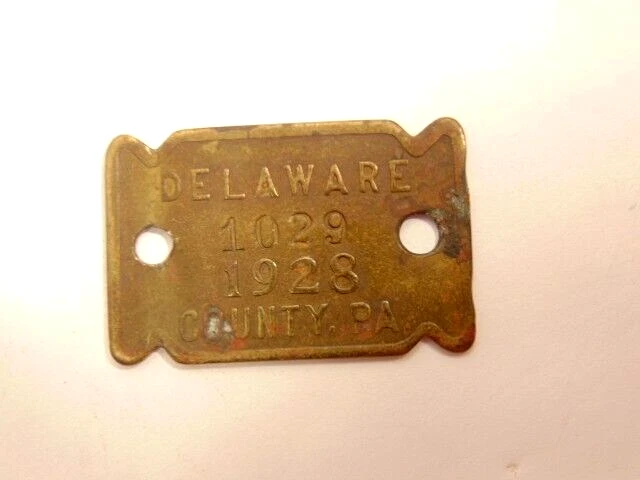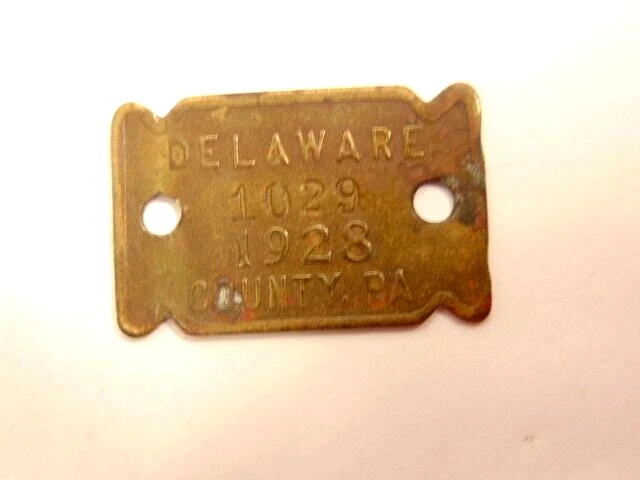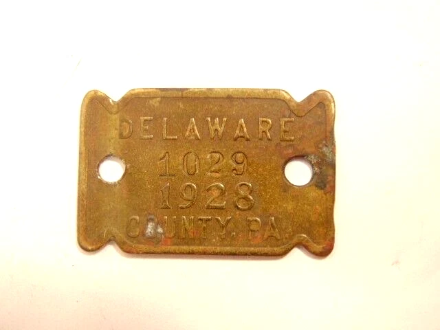 Here is a pre-owned vintage 1928 Delaware County, PA brass metal dog tag. It shows usual tarish, dirt and wear. Please see pictures and ask any questions. Thank you for looking. (Inv A28,684)