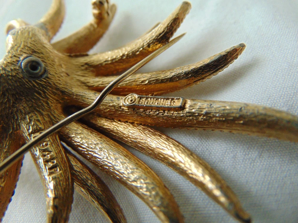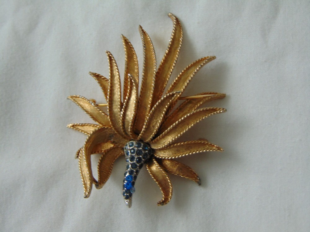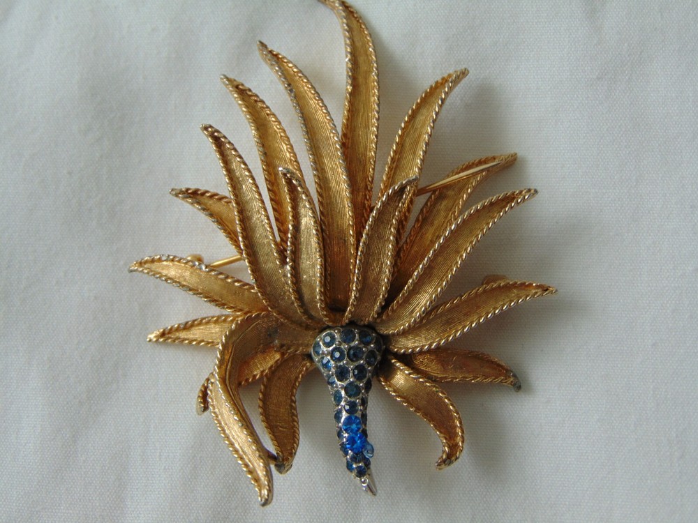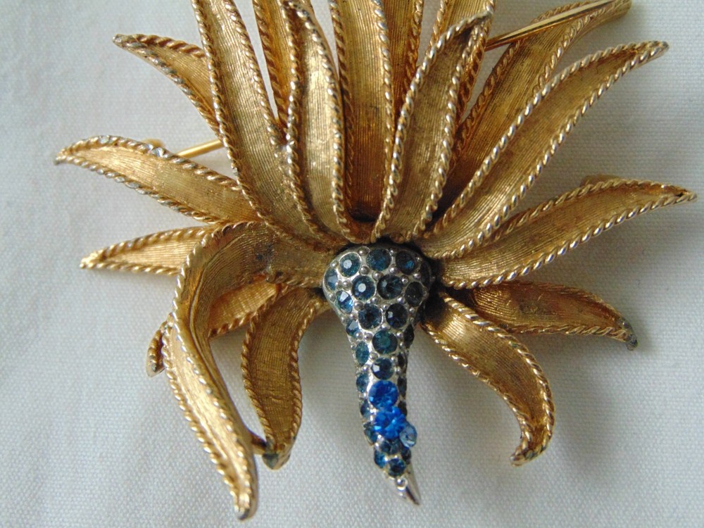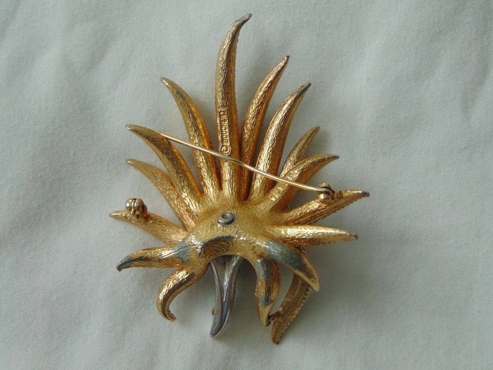 2-3/4 inches long or across, looks like a couple crystals have been replaces. signed Boucher on back of brooch with a number. some wear on plating on back of brooch.