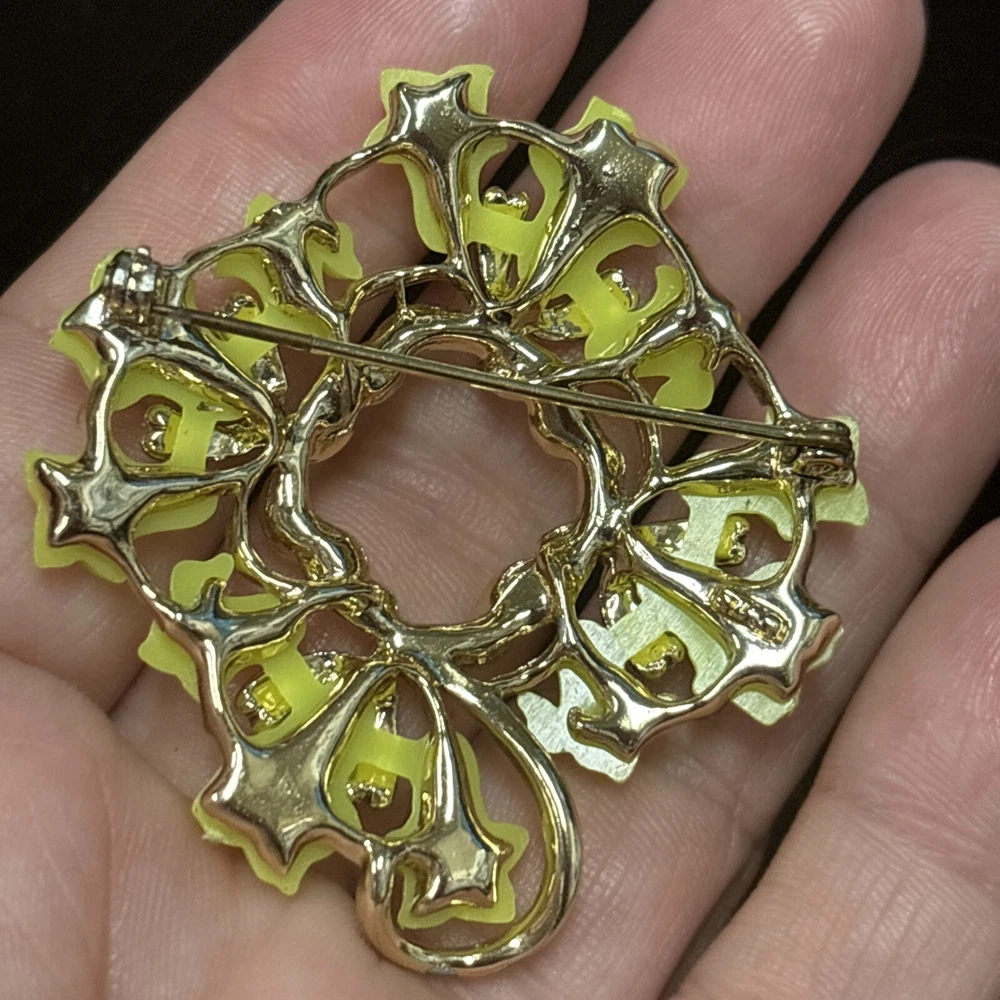 Add a touch of vintage charm to your outfit with this beautiful flower brooch. Crafted from gold-tone metal, this brooch features a lovely green color that will complement any outfit. Measuring at 2 inches in length, this brooch is perfect for any occasion, whether it be a birthday, anniversary, christening, or even Christmas. The brooch is designed in the shape of a flower and features a stunning green main stone color. The plastic material adds a unique touch to the brooch, making it a perfect addition to your vintage jewelry collection. This brooch is perfect for anyone who loves vintage jewelry and wants to add a touch of elegance to their outfit.