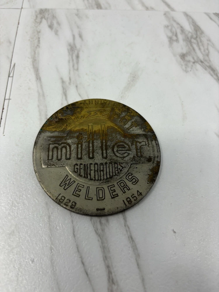This vintage Miller generators Arc Spot Welders 25th Anniversary Token is a rare piece of history. With its unique design and intricate details, it is a must-have for any coin collector or enthusiast. The token celebrates the 25th anniversary of the company and features the iconic Miller generators Arc Spot Welders logo. This Exonumia token is a great addition to any collection and is sure to impress. Its rarity and historical significance make it a valuable piece that should not be missed. Don't wait, add this Miller generators Arc Spot Welders 25th Anniversary Token to your collection today.