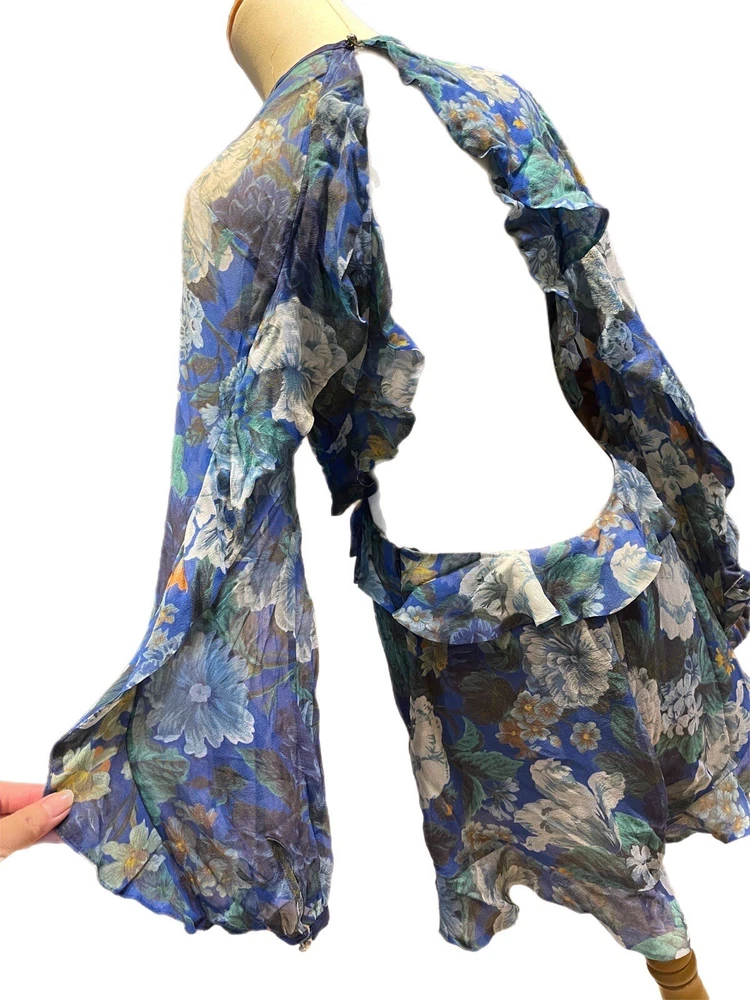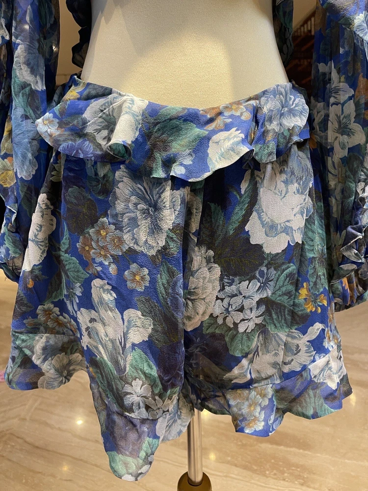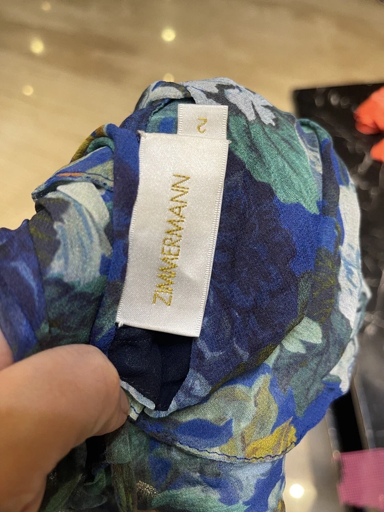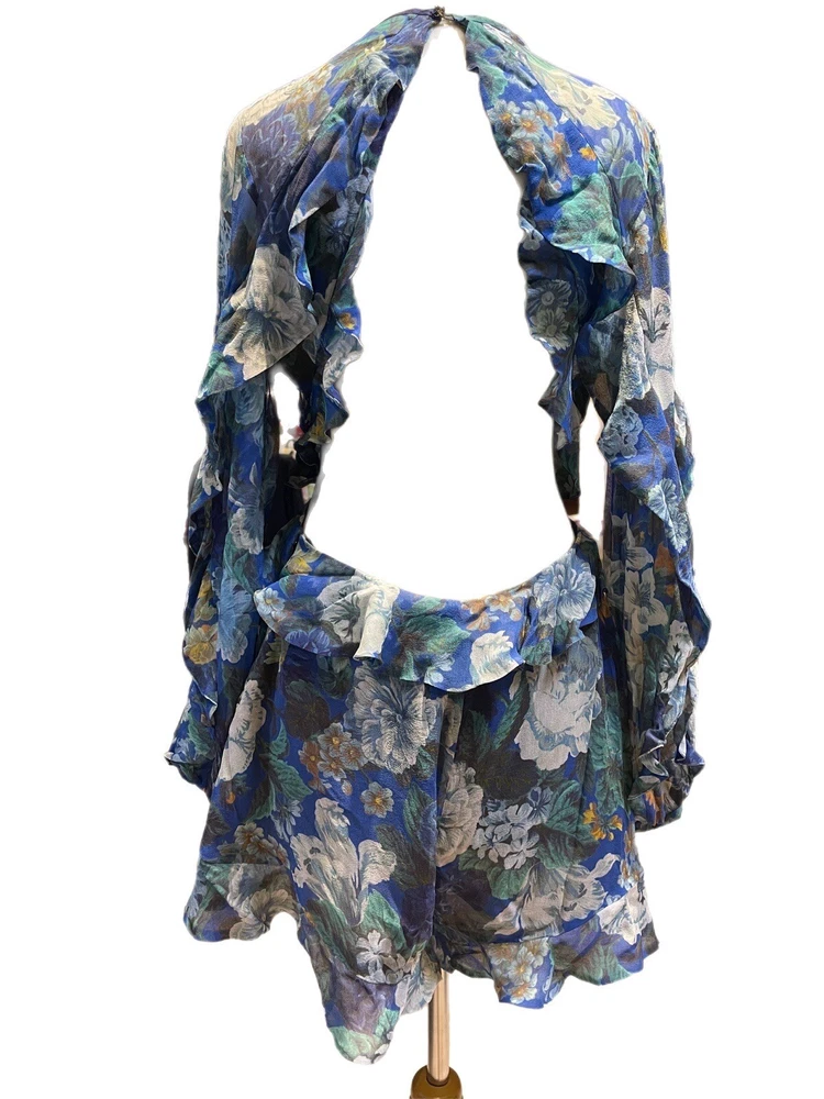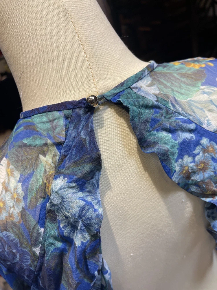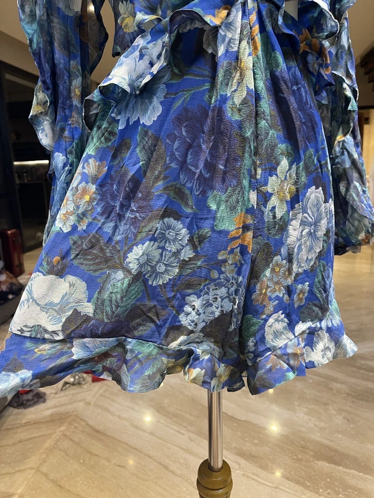 This Zimmermann dress is a pre-owned size 2 made from 100% silk with a blue colour. The dress features a long balloon sleeve, round neck, button closure, and ruffle accents. It has a fit and flare style with a drop waist and is perfect for various occasions such as travel, weddings, holy communion, parties, and more. Additional features include a backless design, side zipper, and lightweight feel. The dress is lined and has a fabric type of rayon. It's a great addition to any wardrobe with its designer, beach, classic, and fun themes. Made in Australia, it's suitable for all seasons and can be dressed up or down for casual or formal events.